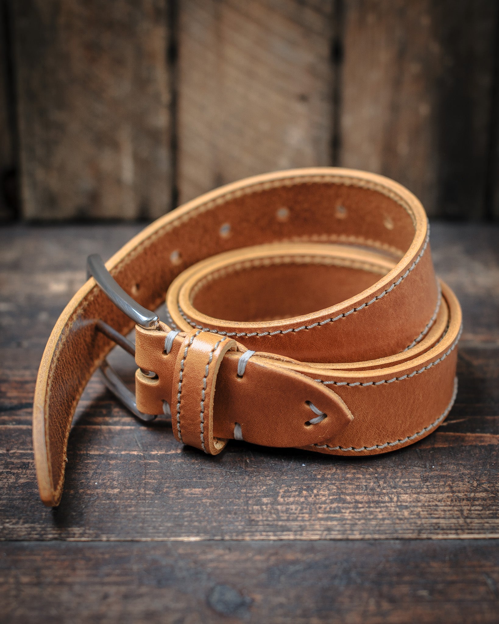 Vores kantsyede bælter er fremstillet af pull-up læder. Det indeholder mere voks og olie end almindelig læder. Det giver sig til udtryk ved, at læderet bliver lysere hvis man bøjer det. Det får sin oprindelige farve igen, når det rettes ud. Vores pull-up læder er en kraftig, utrolig smuk og levende læder.