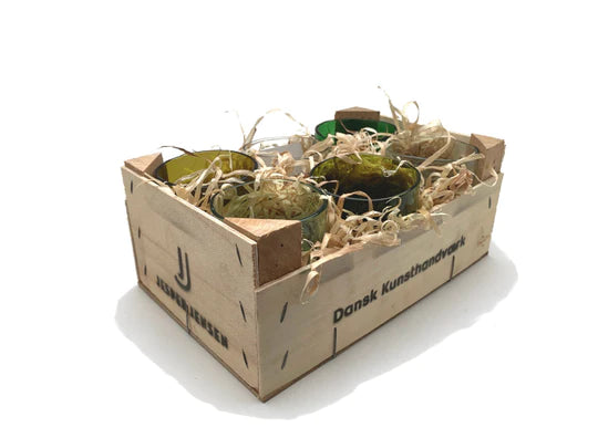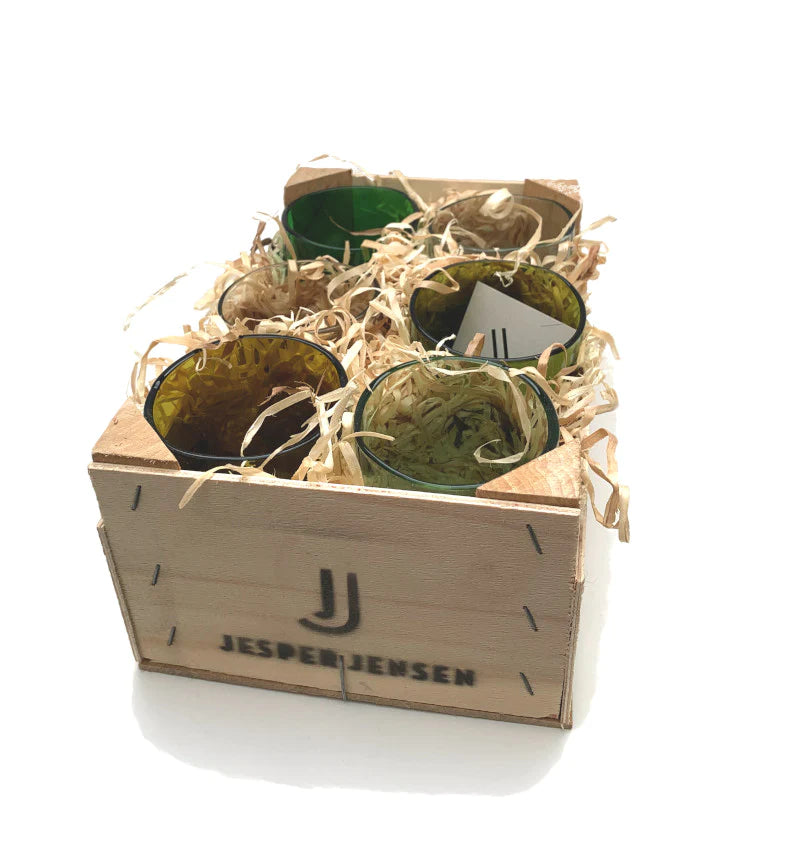 Her er 6 glas flot pakket i en lækker trækasse - fremstillet på fyn.