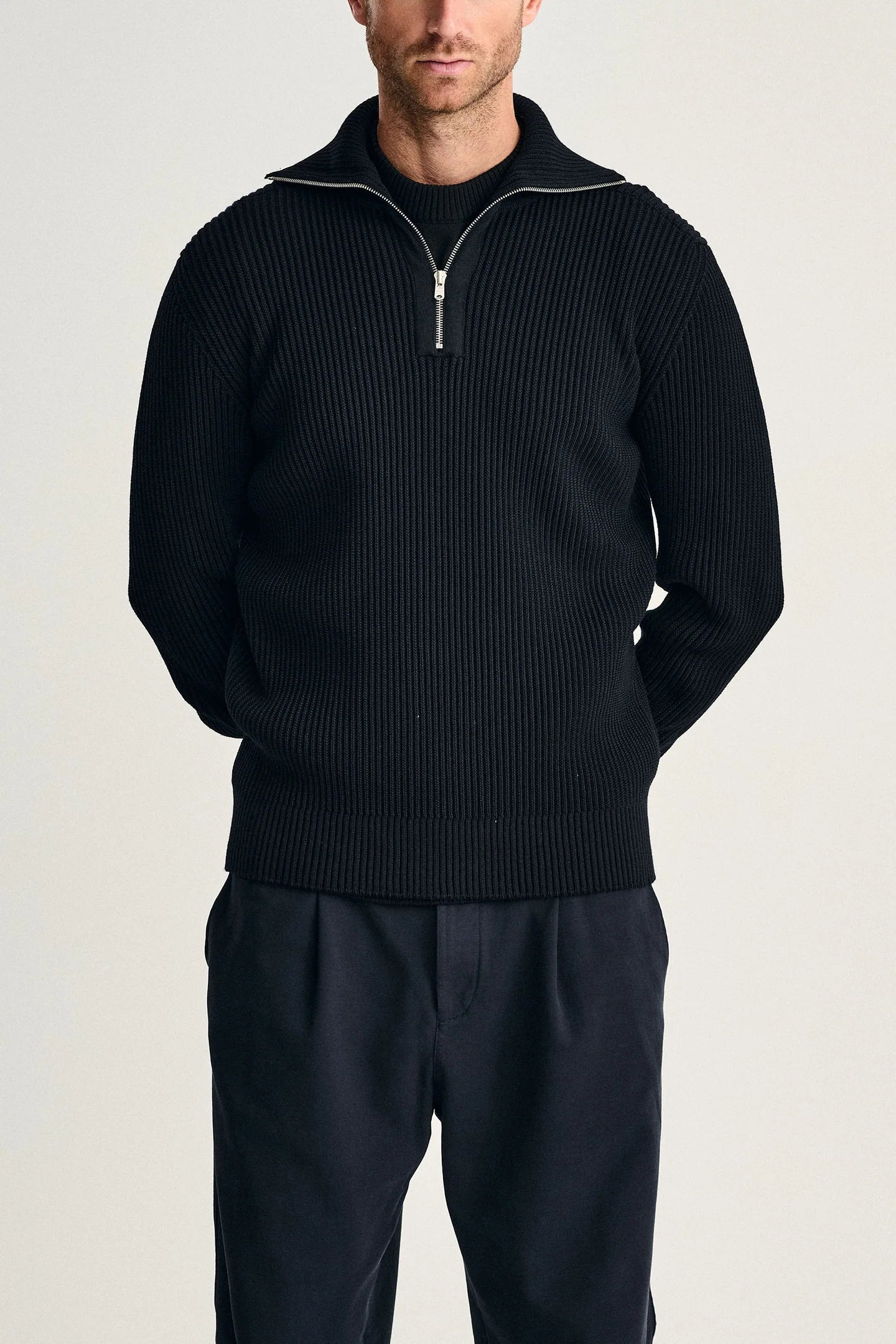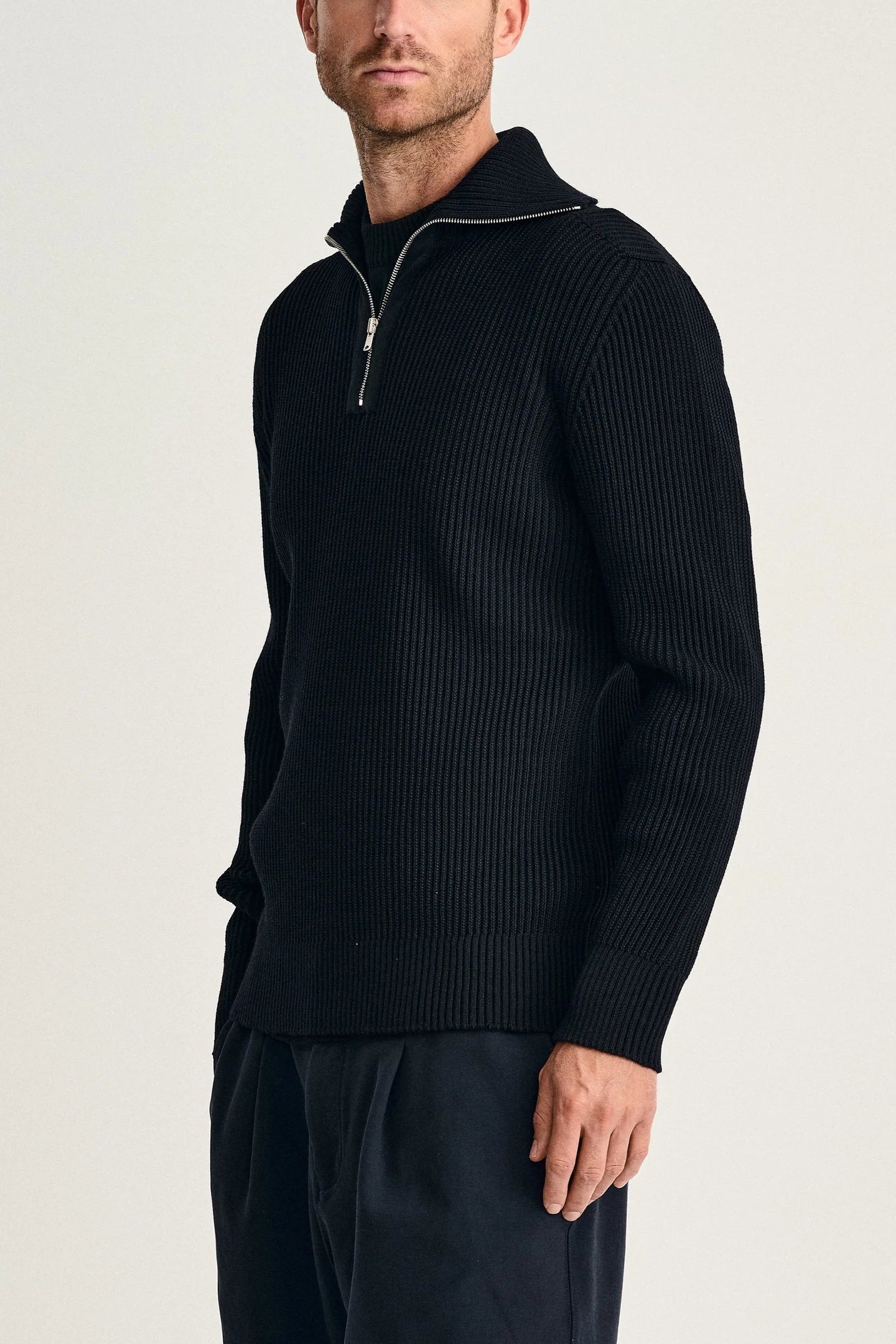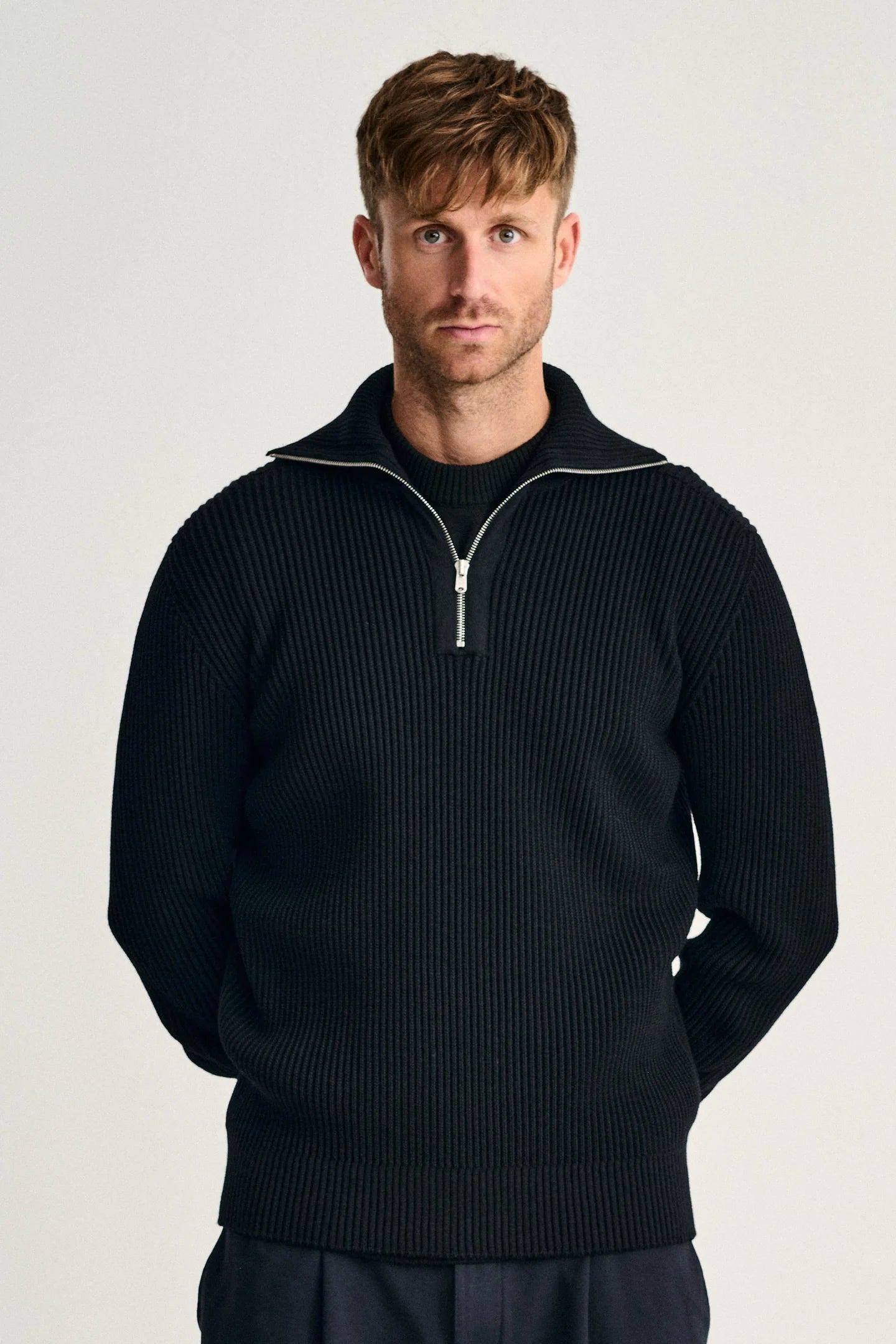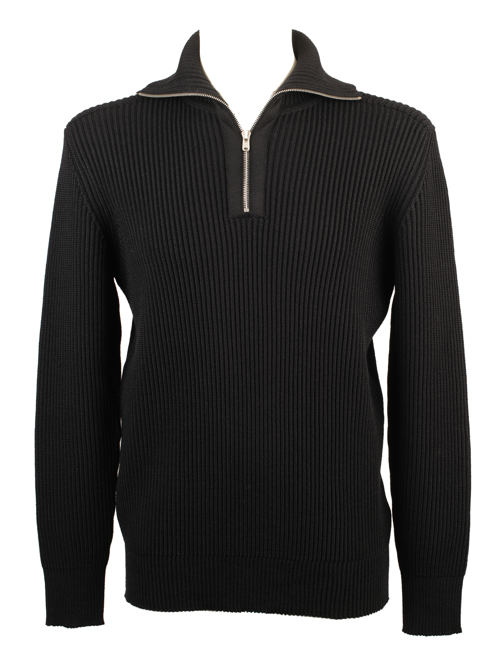 Fender kort lynlås. Tætstrikket elastisk plated-struktur. Fin merino belagt med ren ny uld for styrke og formstabilitet. Fully fashioned-detaljer og en let hævet skulderlinje. Kort RIRI-lynlås foran.
