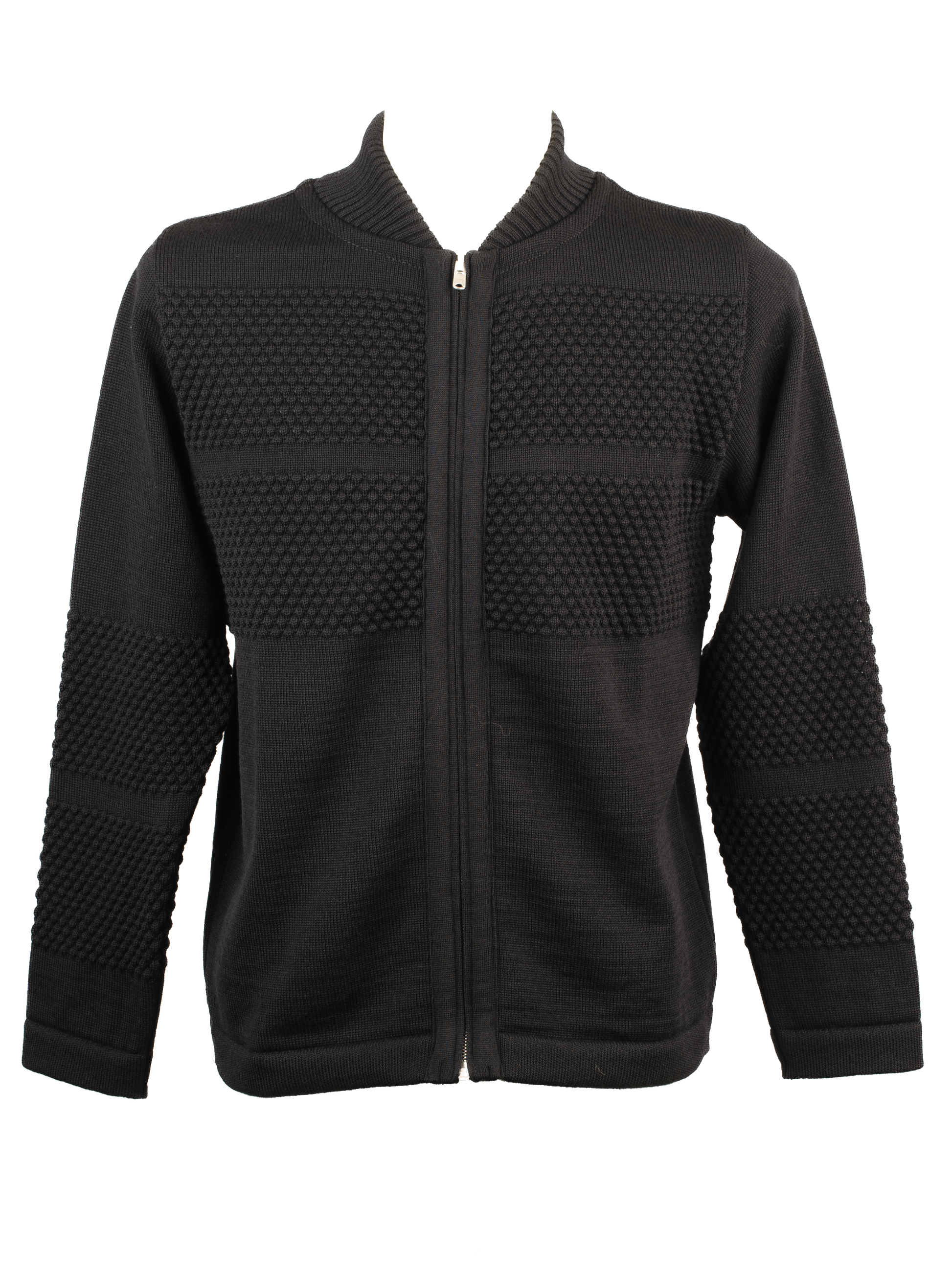 Sømandstrøje i høj hals med gennemgående lynlås. Mønster 1919. I produktion siden 1948. Vinklede ærmer reducerer garnspild og skaber vores karakteristiske dropped shoulder. Boblestrikkede felter blandet med glatstrik. Yderside i robust sømandsuld. Inderside i ekstra fin merino. Gennemgående RIRI-lynlås for jakke-lignende brug.