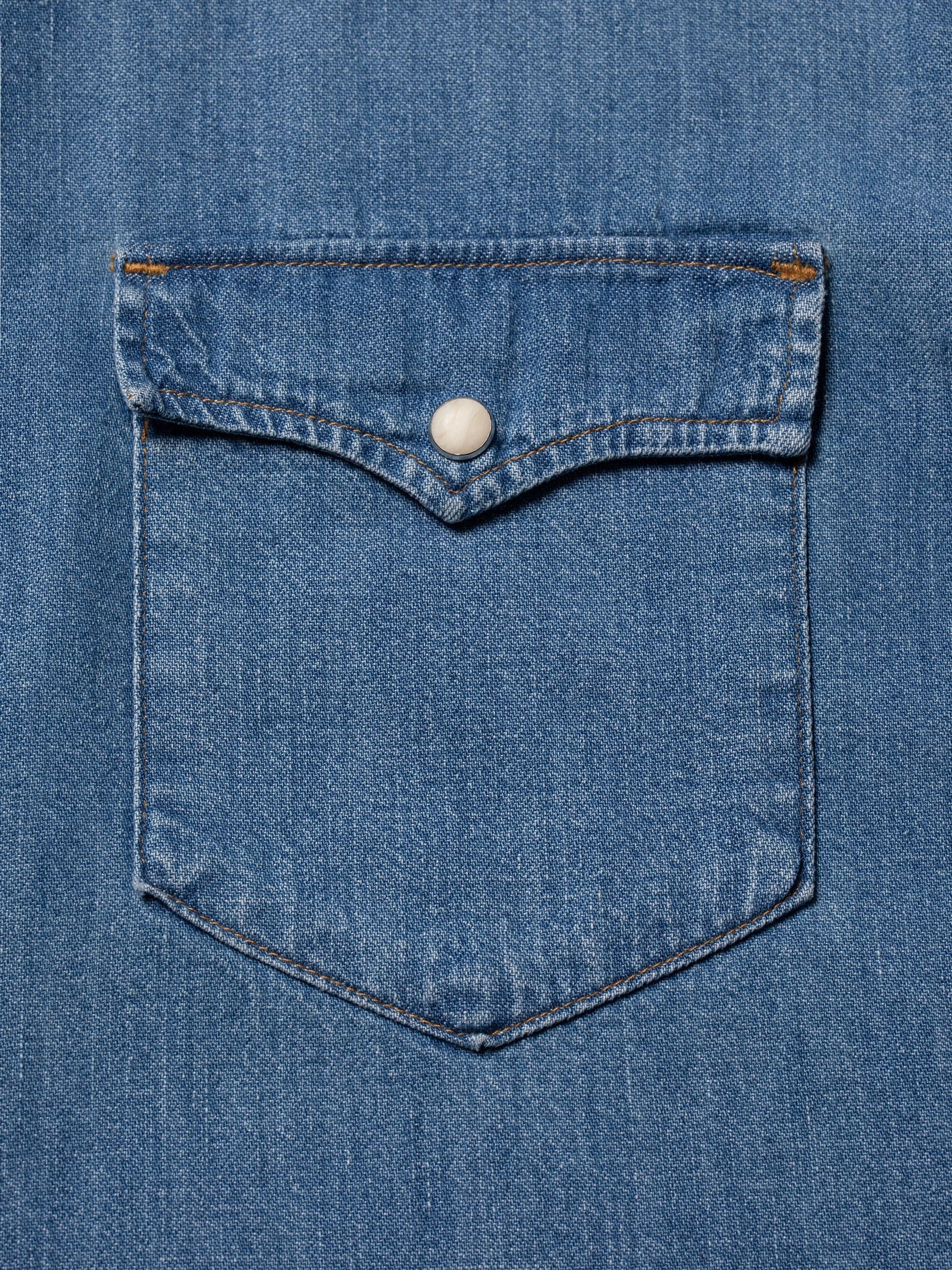 En regular-fit skjorte med et tydeligt western-inspireret look. Påsyede lommer med klap, der lukkes med perlemors trykknapper. George har et rent look, og rider med på den autenticitet, vi elsker ved vintage denimskjorter: velslidt med en ensartet lyseblå tone.