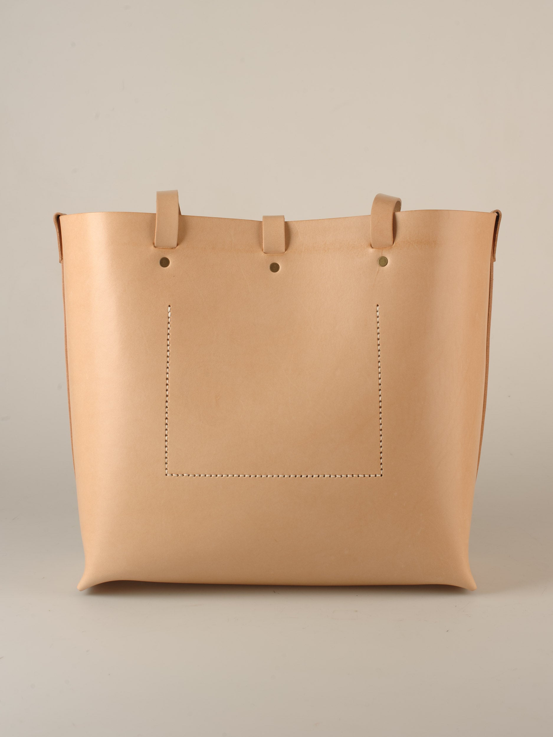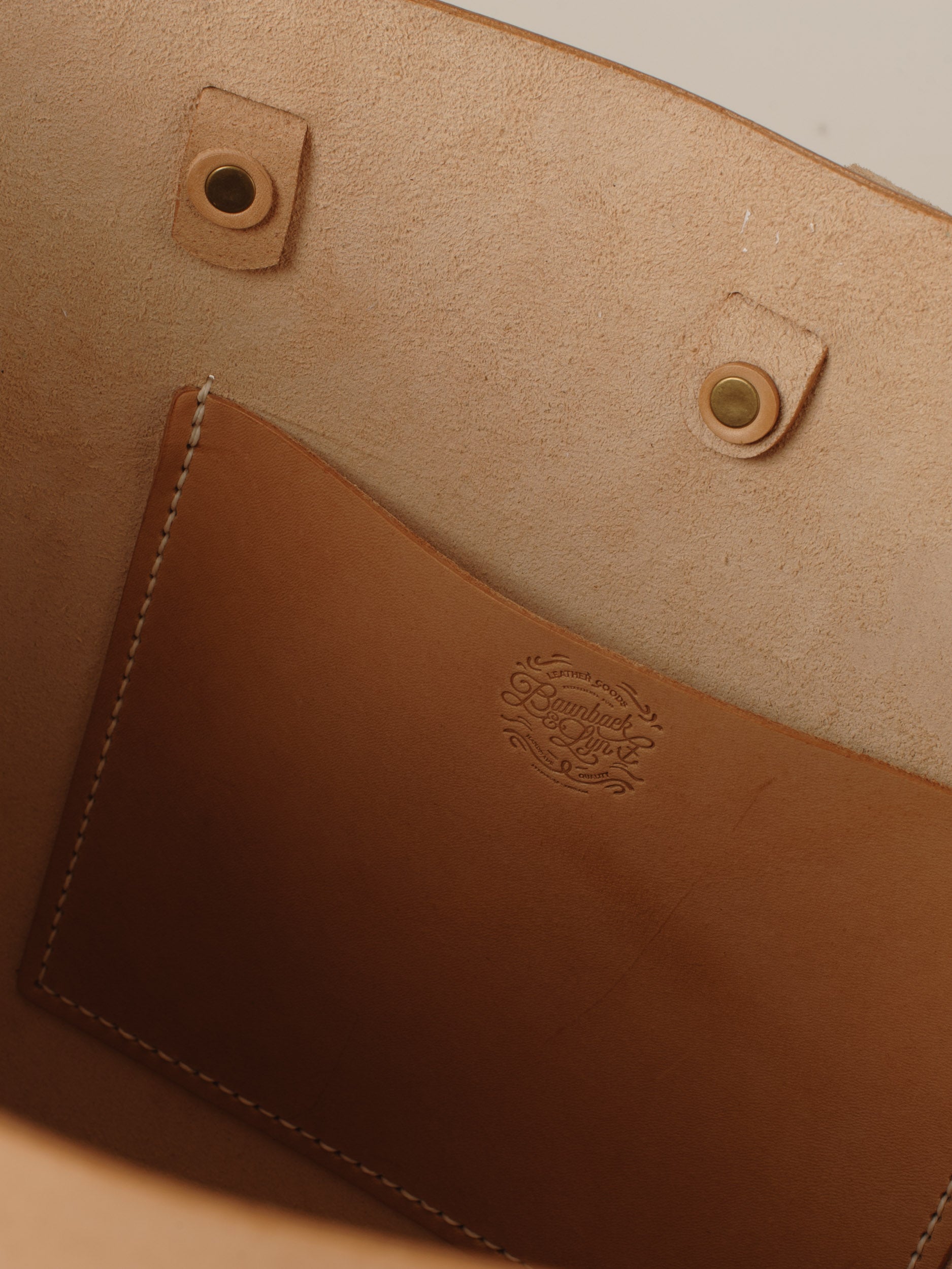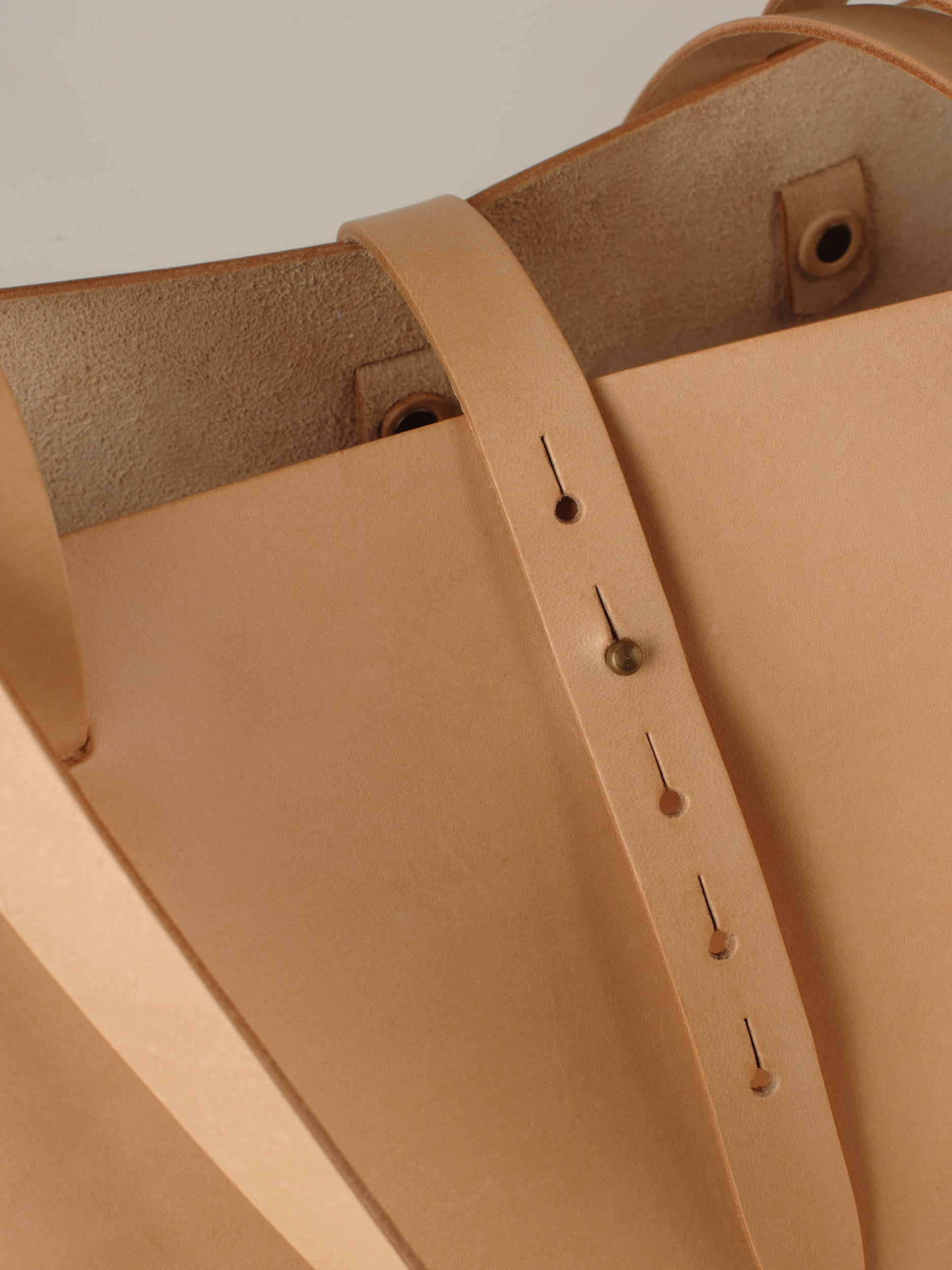 Denne naturfarvede lædertype er ubehandlet fra garveriet, men vi har behandlet tasken med læderfedt for at beskytte materialet bedre. Den sarte, lyse farve vil uundgåeligt blive mørkere med tiden. Både plejemidler og sollys kan gøre tasken mørkere. Undgå derfor at efterlade tasken i direkte sollys over længere perioder.